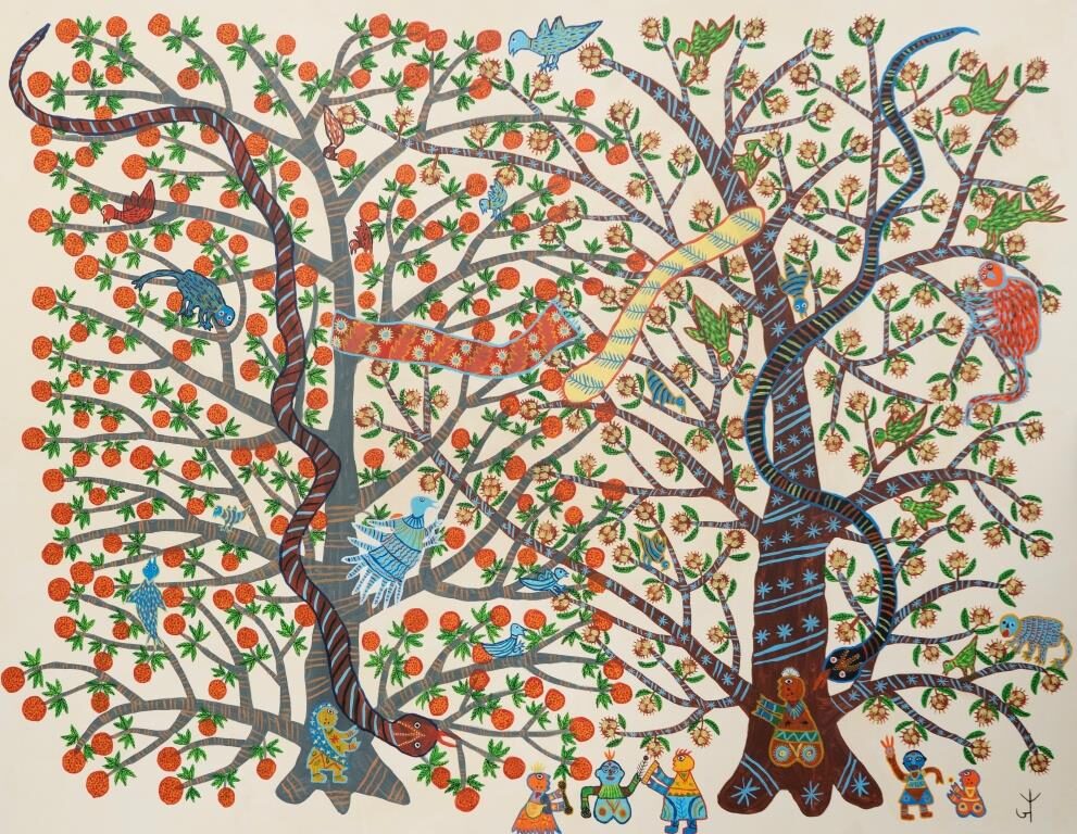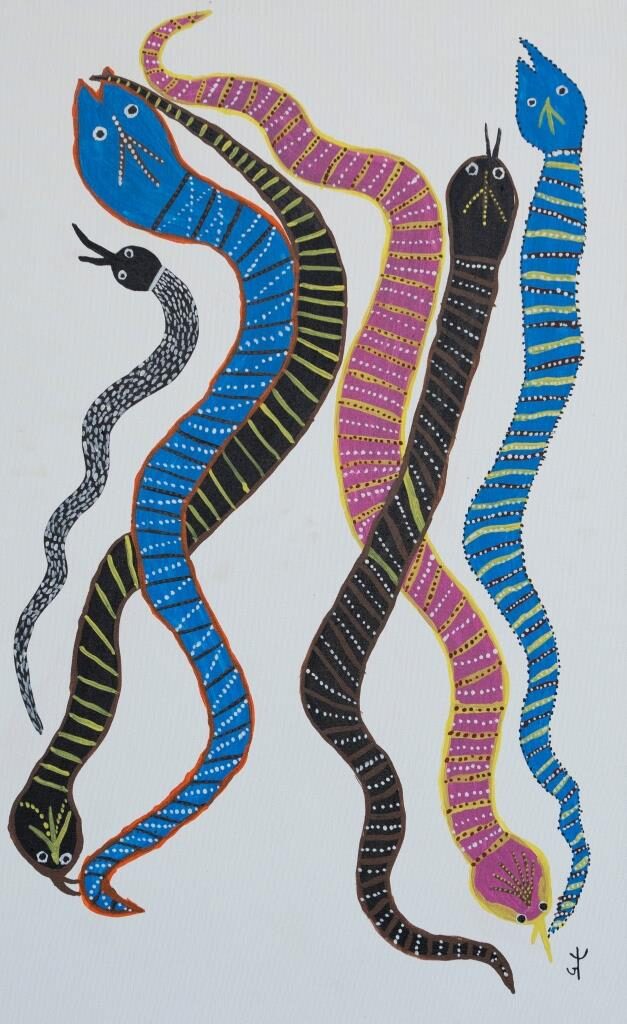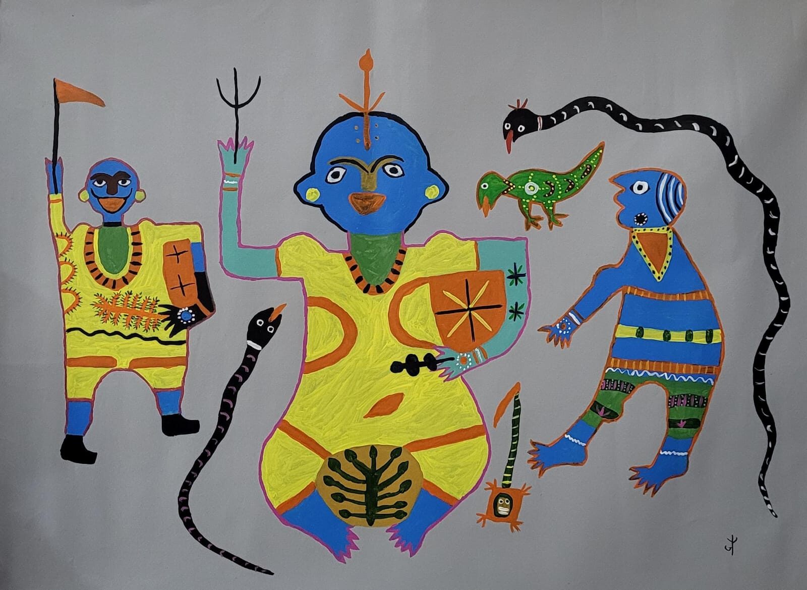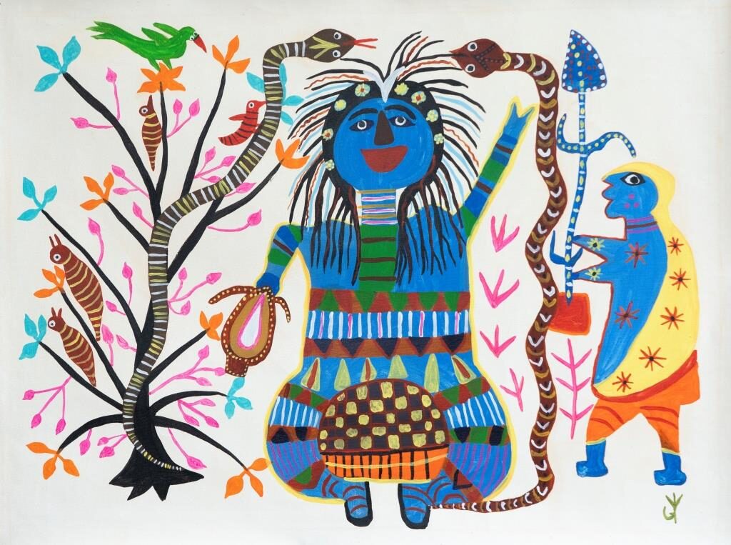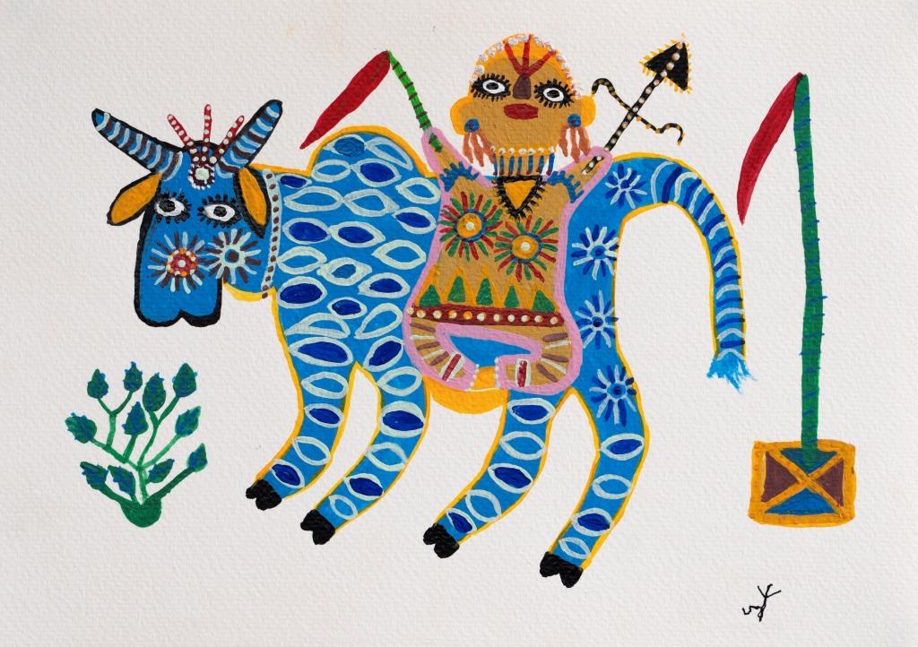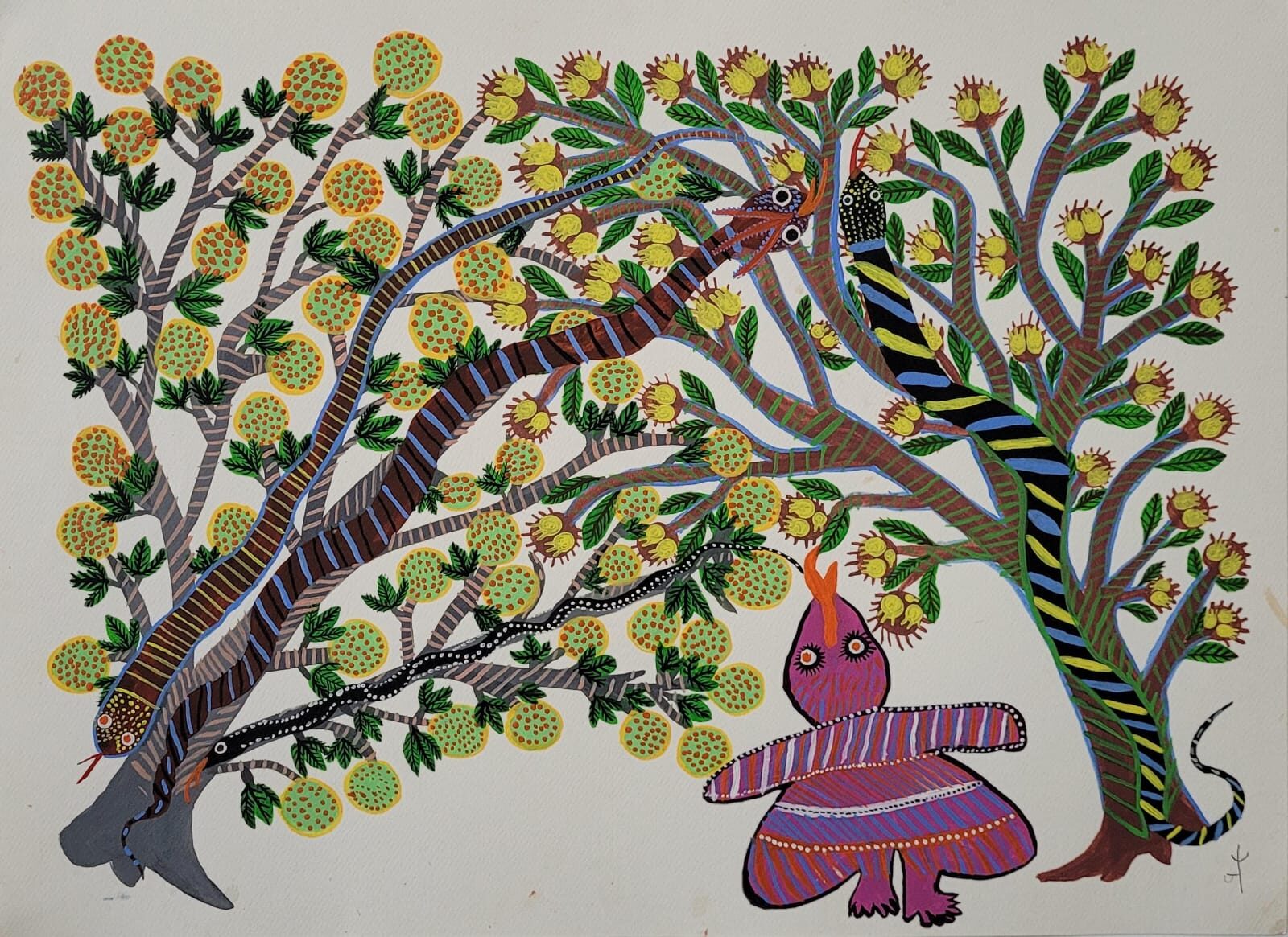 Working with vivid colors and dynamic compositions, Baiga’s art celebrates her community’s deep spiritual connection with nature. At the same time, her paintings often critique environmental destruction, industrialization, and ecological loss—rendered through traditional Baiga motifs and storytelling methods. “Painting gave me the freedom to make my world with my own hands,” she once told art revivalist Mitch Crites, highlighting how creativity became both a voice and a form of liberation.