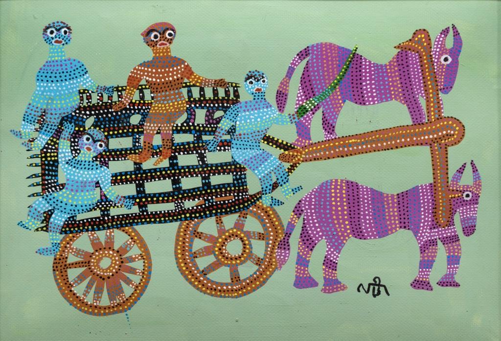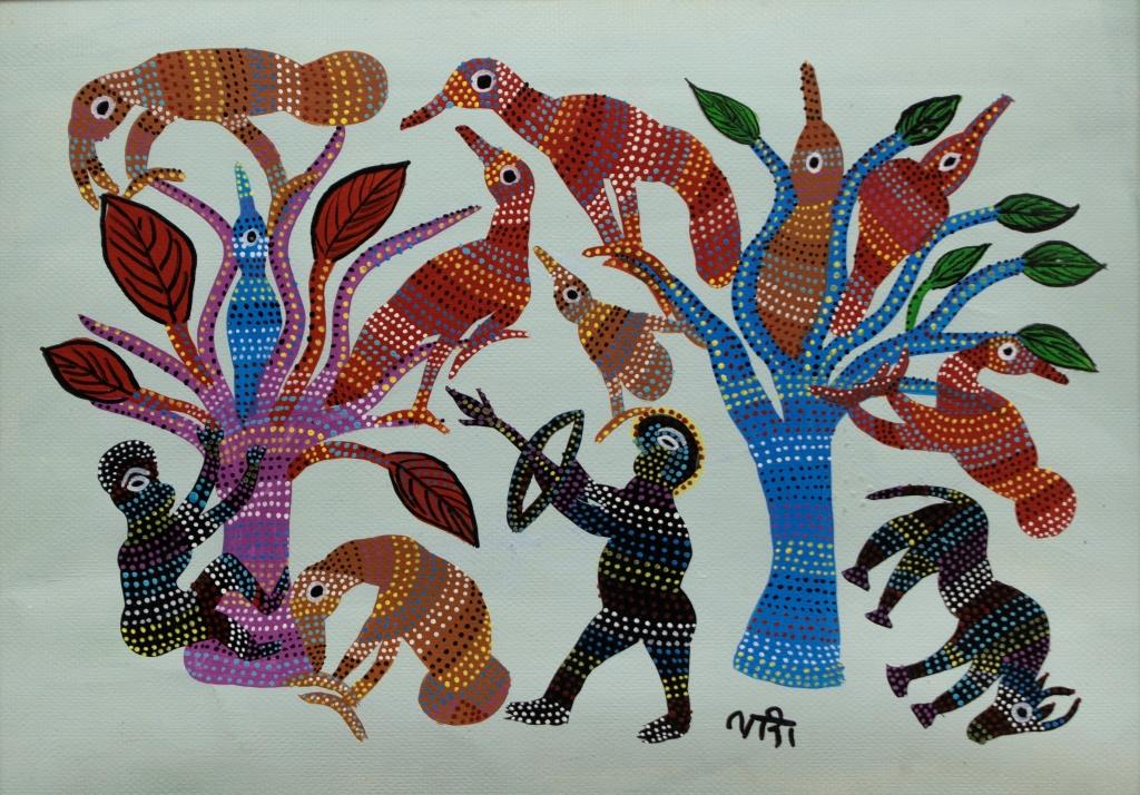 Her signature use of multi-colored dots creates rhythmic, wave-like forms, often featuring birds and nature, reflecting the Bhil community’s animist beliefs. Her themes draw from folklore, festivals, and ancestral life.