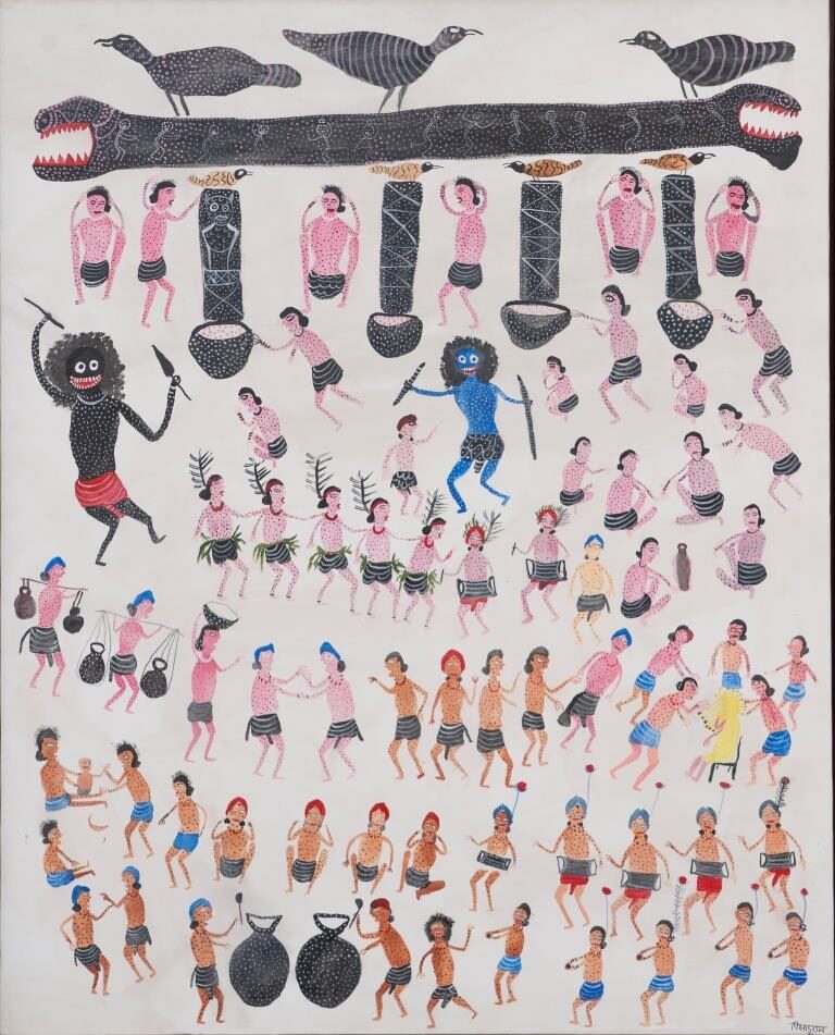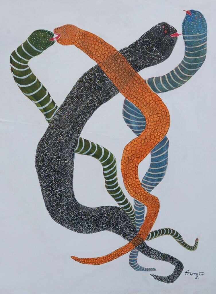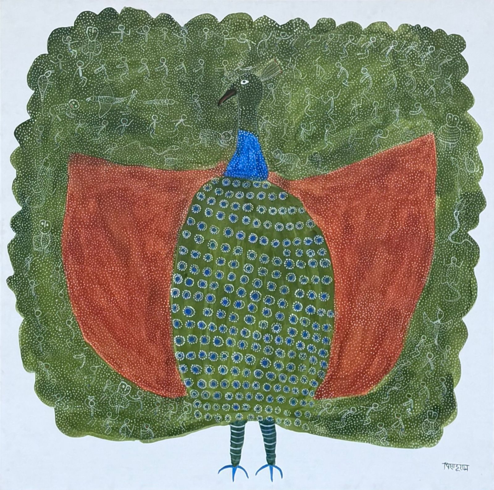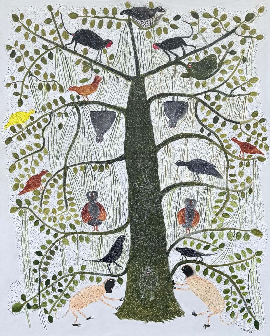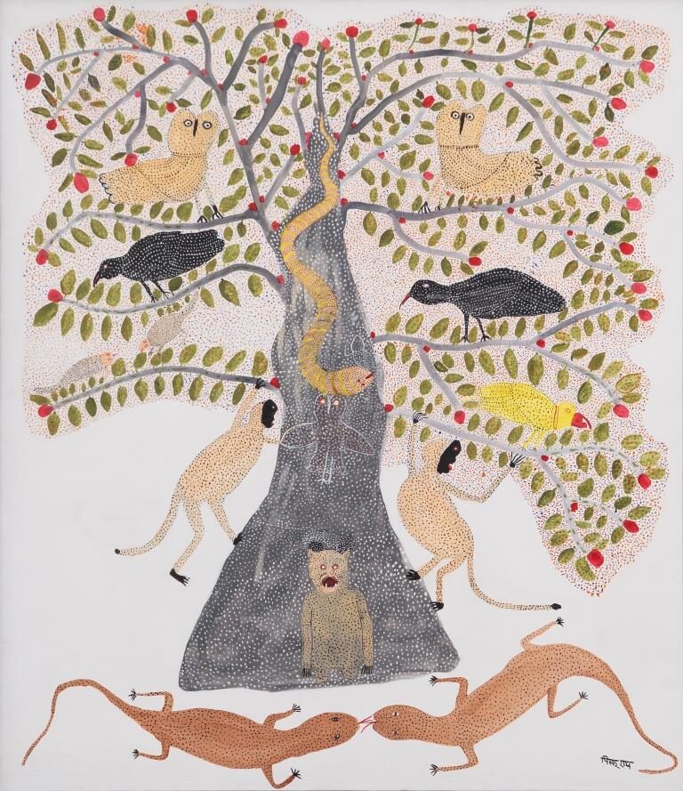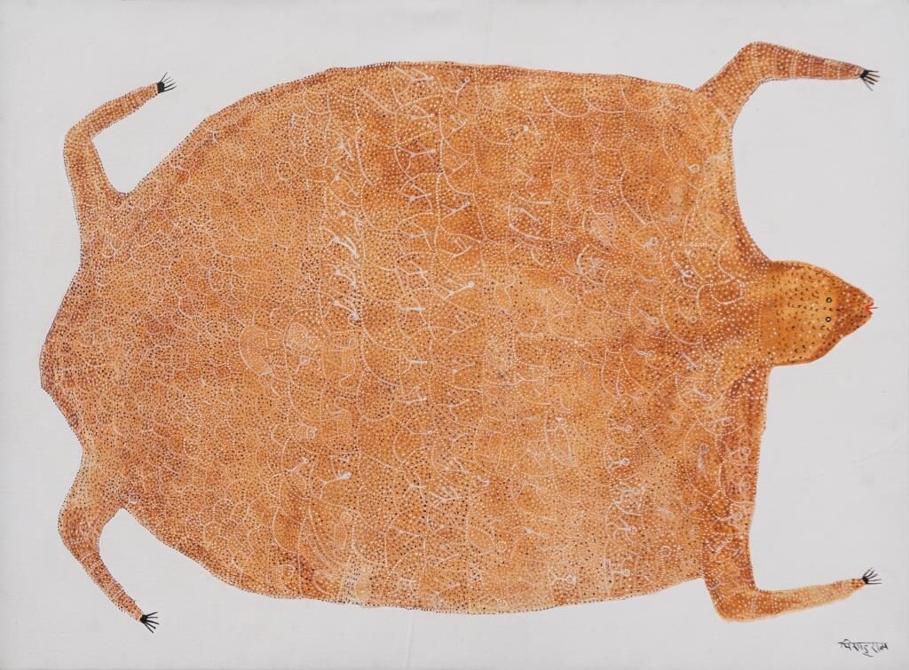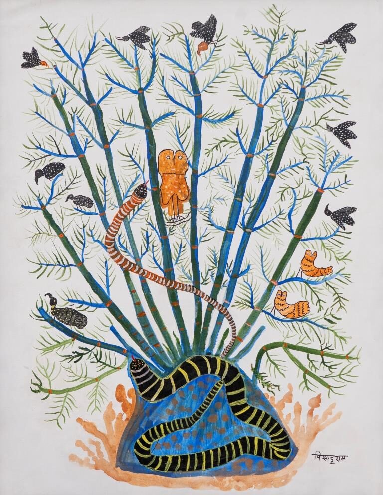 Pisadu Ram Mandavi (b. 1956) is an artist from the Muria tribe of Chhattisgarh, a community known for its profound cultural connection to nature. He began his artistic journey through traditional Muria wood carving and later expanded his practice to painting.